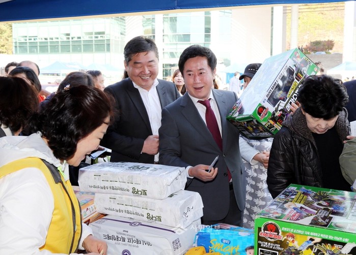 경기 용인시 기흥장애인복지관·이마트(7개점)·용인중앙시장상인회는 지난 28일 시청 광장에서 '제5회 희망나눔 상생바자회'를 개최했다. 사진은 바자회에 참석한 정찬민 용인시장(가운데)이 물품을 구매하는 모습.(사진제공=용인시청)