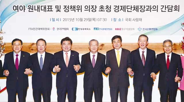 29일 서울 여의도 국회 사랑재에서 열린 여야 원내대표 및 정책위의장 초청 경제단체장과의 간담회에서 참석자들이 손을 맞잡고 기념촬영을 하고 있다. 왼쪽부터 새누리당 김정훈 정책위의장, 박용만 대한상공회의소 회장, 새누리당 원유철 원내대표, 김인호 한국무역협회장, 새정치민주연합 이종걸 원내대표, 허창수 전국경제인연합회장, 허영구 전국은행연합회장.