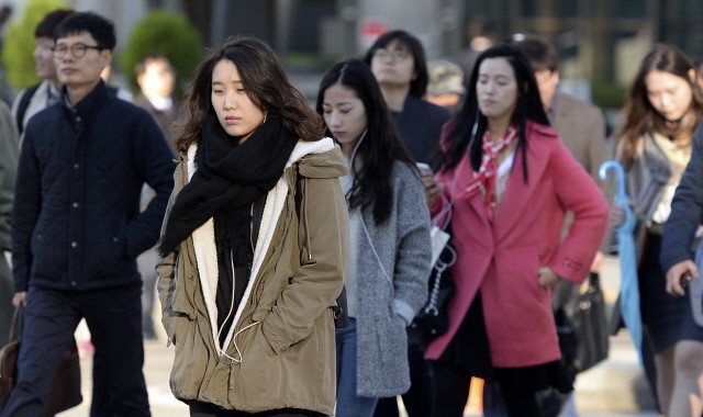 올 가을 들어 가장 추운 아침 날씨를 보인 29일 오전 서울 광화문 네거리에서 시민들이 출근길 발걸음을 재촉하고 있다.