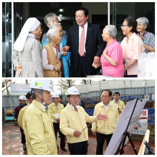| ▲(위)시는 노인종합복지회관을 통한 다양한 건강복지 프로그램 운영으로 노인들의 복지증진에 힘쓰고 있다. 사진은 노인들과 이야기를 나누고 있는 조 시장(가운데)의 모습. ▲(아래) 공사현장을 방문한 조 시장(가운데)이 현장 상황을 보고받고 관계자들과 이야기를 나누고 있다. |