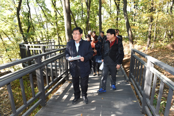 김성환 서울 노원구청장(왼쪽)이 최근 중계동 산40-1번지에서 열린 ‘노원자연마당·자락길·생태학습관 준공식’에 참석해 구청 관계자·주민들과 함께 자락길을 둘러보고 있다.(사진제공=노원구청)