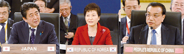 아베 신조(왼쪽부터) 일본 총리와 박근혜 대통령, 리커창 중국 국무원 총리가 1일 오후 청와대에서 열린 제6차 한·일·중 정상회의에서 모두발언을 하고 있다.