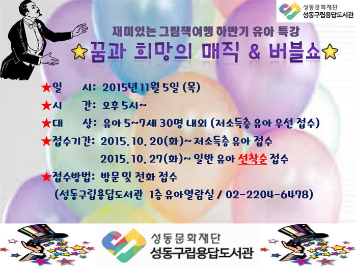 마술쇼는 11월5일 오후 5시 용답도서관 문화강좌실 RED에서 막을 올리며 마술과 버블쇼, 요술 풍선을 통해 아이들의 창의력, 상상력을 증진시키는데 큰 역할을 할 것으로 보인다.