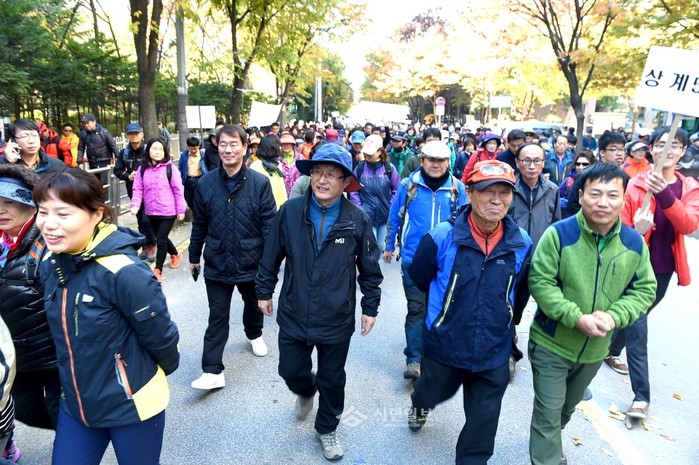 김성환 노원구청장(가운데)이 최근 수락산 수락골 입구에서 열린 ‘2015 수락산 둘레길 문화축제’에 참석해 주민들과 산길걷기를 출발하고 있다.(사진제공=노원구청)