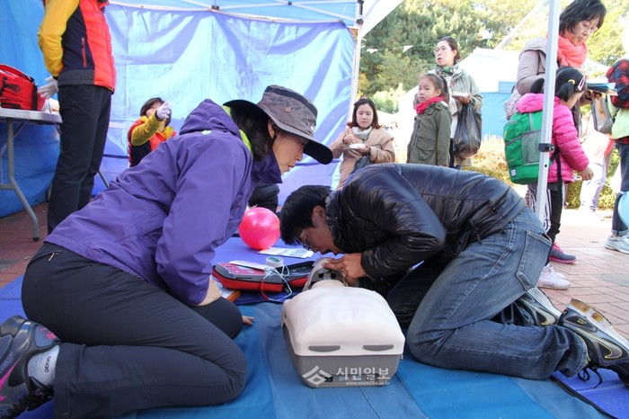 서울 동작소방서는 지난 31일 오후 1시 보라매공원에서 열린 '동작구 오색공감 페스티벌'에서 심폐소생술 체험 부스를 운영했다. 사진은 체험 부스를 방문한 시민이 심폐소생술 실습을 하는 모습.(사진제공=동작소방서)