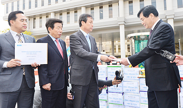 한국사 교과서 국정화 고시의 행정예고 기간이 끝나는 2일 오후 새정치민주연합 도종환, 유인태, 박홍근 의원이 정부세종청사 교육부 앞에서 김동원 교육부 학교정책실장에게 40만여건의 반대서명과 특위의견서를 포함한 1만8000여부의 국정화 반대의견서를 제출하고 있다.