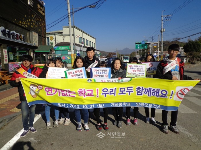 경기 양평군 보건소는 지난 31일 개군중학교 금연 동아리와 연계해 학생들이 직접 참여하는 금연캠페인을 실시했다. 사진은 캠페인에 참가한 학생들의 모습.(사진제공=양평군청)