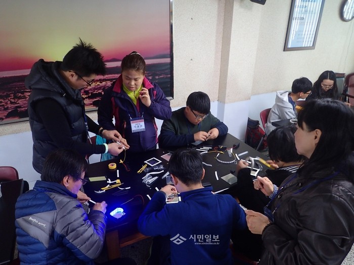 인천남부교육지원청은 최근 강화도 해양환경체험학습장에서 남부영재교육원 1학년을 대상으로 학생·학부모가 함께하는 '남부영재 가족공감 체험캠프'를 실시했다. 사진은 참석자들이 영재교육 프로그램을 실습 중인 모습.(사진제공=인천남부교육지원청)