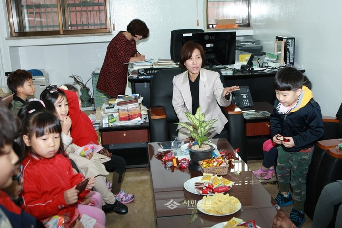 이영심 서울 강북구의원은 최근 강북구의회 운영위원장실을 방문한 '성문서머힐 어린이집(삼양동 소재)' 이현신 원장과 원아 12명과 담소를 나누고 있다. 원아들은 구의회 곳곳을 견학하며 구의회의 역할에 대해 배우는 시간도 보냈다. (사진제공=강북구청)