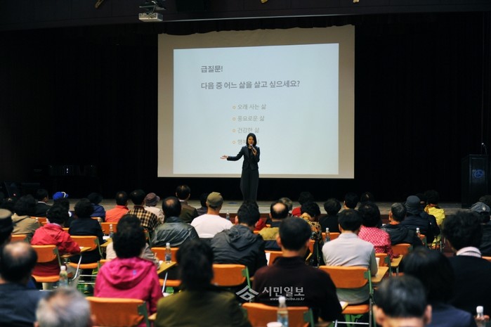서울 동대문구는 최근 구청 강당에서 '꿈을 여는 동대문 명사특강'을 개최했다. 사진은 행사에 강사로 참석한 김현정 서울시 동부병원장이 ‘의사는 수술받지 않는다’라는 주제로 열강을 펼치고 있는 모습.(사진제공=동대문구청)