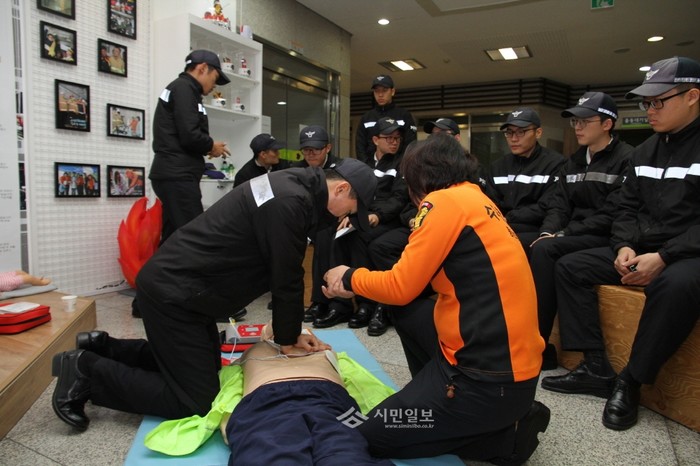 서울 동작소방서는 지난 3일 오후 3시 소방서 열린CPR카페에서 동작경찰서 방범순찰대원 15여명에게 응급처치법 교육을 실시했다. 사진은 심폐소생술 교육이 진행 중인 모습.(사진제공=동작소방서)