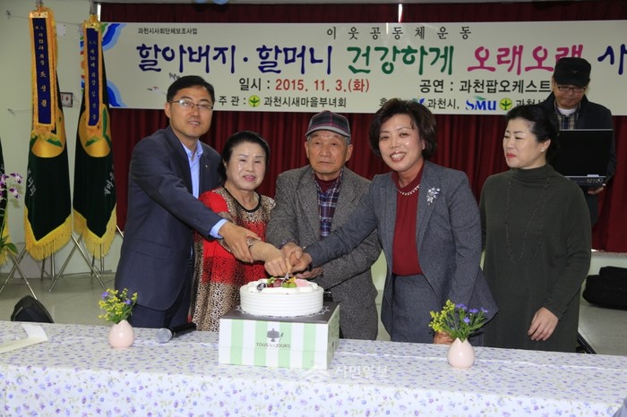 신계용 경기 과천시장은 지난 3일 과천시새마을회관 대강당에서 열린 '홀몸노인 생신상 차려드리기' 행사에 참석했다. 사진은 신 시장(오른쪽에서 두 번째)이 노인들과 케이크를 자르는 모습.(사진제공=과천시청)
