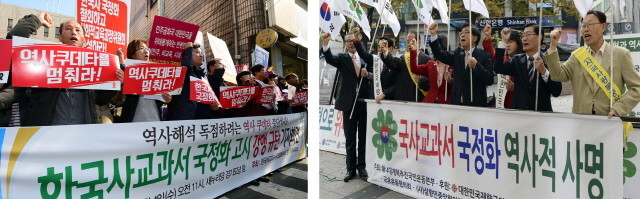왼쪽 4일 오전 경기도 수원시 새누리당 경기도당 앞에서 한국사 교과서 국정화 저지 경기네트워크 회원들이 역사교과서 국정화 고시 강행을 규탄하며 구호를 외치고 있다.