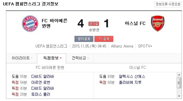 5일 새벽(한국시간) 독일 알리안츠 아레나에서 열린 아스날과 바이에른 뮌헨(이하 뮌헨)의 2015-2016 시즌 챔피언스리그 F조 예선 4차전에서 뮌헨은 레반도프스키, 토마스 뮬러, 다비드 알라바, 아르옌 로번의 골에 힘입어 아스날에 4대 1로 앞섰다.