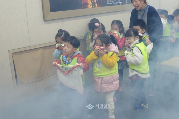영등포소방서는 지난 4일 소방서 4층 소방안전체험관에서 신길동 소재 하정어린이집 보육교사와 어린이 50여명을 대상으로 '소방안전체험'을 실시했다. 사진은 어린이들이 화재 발생시 대피요령 실습을 하는 모습.(사진제공=영등포소방서)