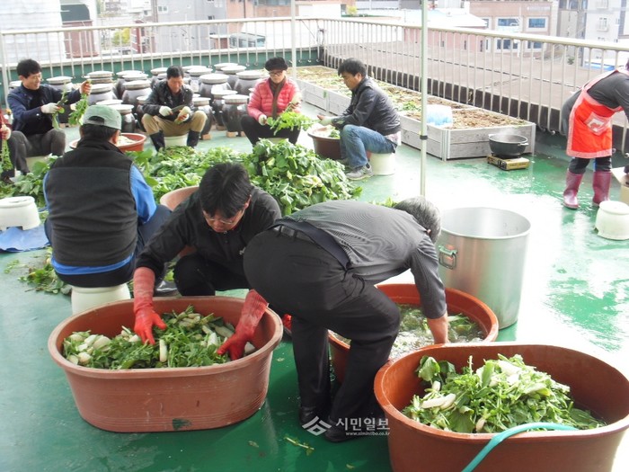 서울 은평구 응암3동에서는 최근 주민센터 옥상에서 주민자치위원회, 새마을부녀회, 우리동네복지두레 회원들이 함께 무김치를 만들어 지역내 홀몸노인 등 40가구에 전달했다. 사진은 관계자들이 무김치를 만드는 모습.(사진제공=은평구청)