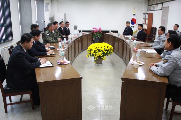 경기 이천경찰서는 지난 4일 오전 경찰서 2층 소통마루에서 '특수전사령부 헌병대와 업무협의 간담회'를 개최했다.사진은 간담회에 참석한 관계자들이 대화를 나누는 모습.(사진제공=이천경찰서)