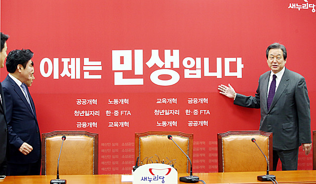 5일 서울 여의도 국회에서 열린 새누리당 최고위원회의에서 김무성 대표가 ‘이제는 민생입니다’라고 말하고 있다.