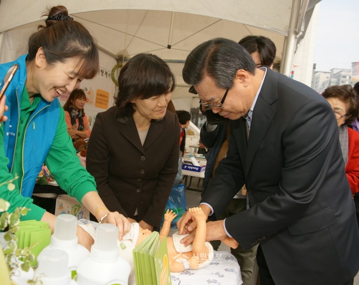 지난 5일 용산구 용산역 광장에서 지역내 사회적기업·마을기업·협동조합 등 19개 업체가 참가한 가운데 열린 '2015년 용산구 사회적경제 한마당'을 찾은 성장현 용산구청장이 (주)송지를 방문해 아기인형에 천기저귀를 갈고 있다.