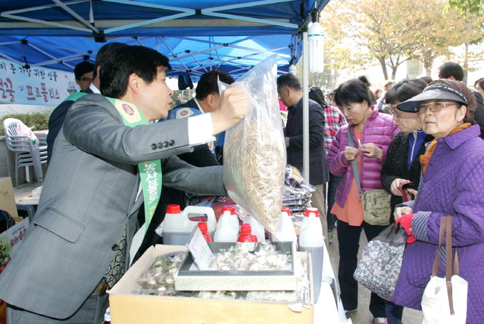 나상성 경기 광명시의회 의장은 최근 농협 광명시지부 앞 노상에서 열린 경북 안동시 농특산물 직거래 장터에 참석했다. 사진은 시민을 대상으로 나 의장이 각종 농산물을 판매하는 모습.(사진제공=광명시의회)