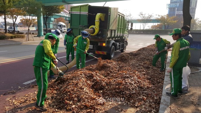 경기 수원시 권선구는 가을철 낙엽수거기간을 맞아 오는 12월 말까지 '집중수거기간'으로 정해 수거된 낙엽 전량을 '당수시민농장'으로 반입할 계획이다. 사진은 최근 관계자들이 낙엽을 수거하는 모습.(사진제공=권선구청)