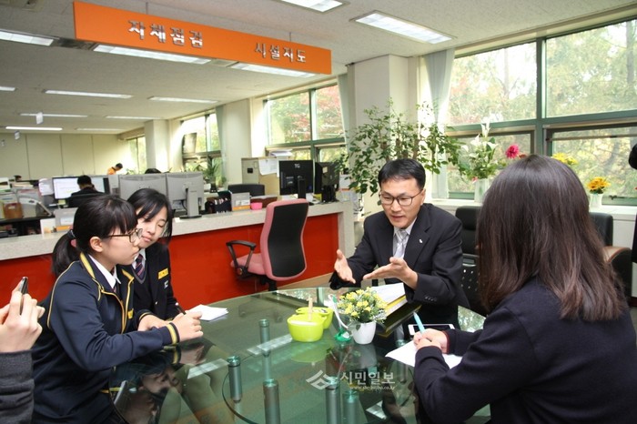 지난 5일 서울 동작구 사당중학교 학생기자단 4명이 동작소방서를 방문해 소방관을 취재했다. 사진은 이번에 방문한 학생기자단이 소방서 관계자와 이야기를 나누는 모습.(사진제공=동작소방서)