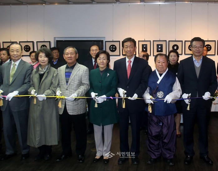 신연희 서울 강남구청장(가운데)이 지난 5일 오후 3시 강남구 서울중요무형문화재전수회관에서 열린 ‘귀금속전통공예 황갑주 장인 회갑전’에 참석해 테이프 커팅을 하고 있다.(사진제공=강남구청)