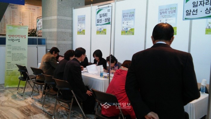 최근 서울 성동구와 중소기업중앙회가 장년층에 취업의 기회를 제공하기 위해 구청 1층 비전갤러리에서 개최한 ‘2015 장년층 일자리 상담회’에 참가한 구직자들이 일자리 상담을 받고 있다.(사진제공=성동구청)