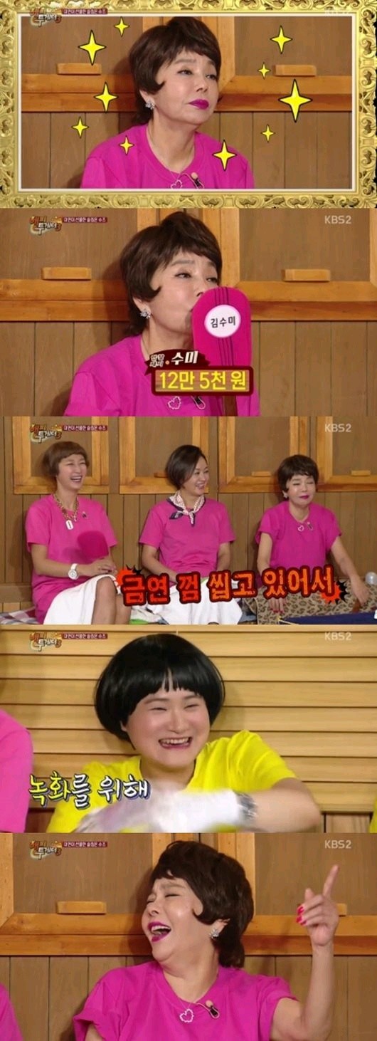 이날 김수미는 "왜 입을 가리고 말하냐"는 말에 "지금 금연껌 씹고 있다"고 말해 스튜디오를 웃음바다로 만들었다.