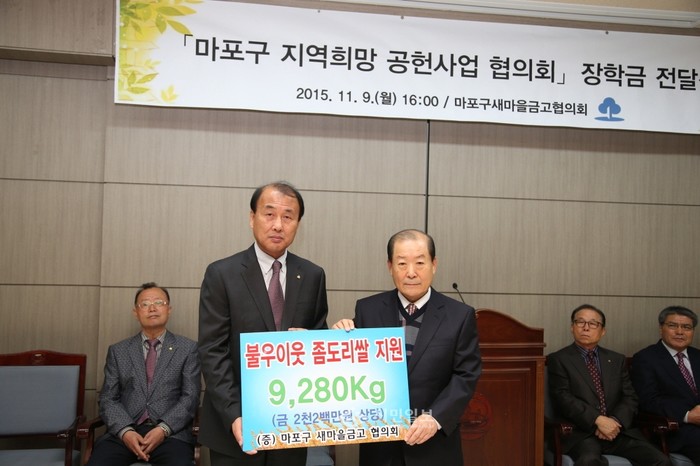 지난 9일 박홍섭 서울 마포구청장(오른쪽)이 구청 4층 시청각실에서 열린 '마포구 지역희망 공헌사업 협의회'의 장학금 및 좀도리쌀 전달식에 참석해 김성우 마포구 새마을금고협의회장(왼쪽)에게 불우이웃 좀도리쌀 9280kg을 기증받고 기념촬영을 하고 있다. (사진제공=마포구청)