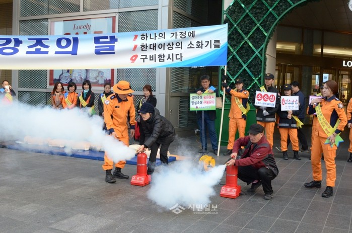 영등포소방서는 지난 10일 영등포역 광장에서 소방공무원, 의용소방대 등이 참여한 가운데 화재에 시민들의 경각심을 유도하기 위해 가두 캠페인을 실시했다. 사진은 캠페인에 참석한 시민들이 '소화기 사용 실습'을 하는 모습.(사진제공=영등포소방서)