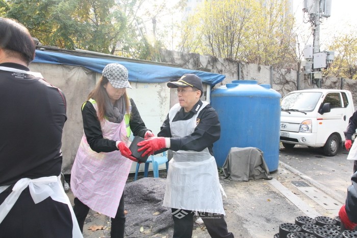 경기 구리경찰서는 11일 시민단체인 시민경찰봉사회와 함께 교문동 및 인창동 소재 홀몸노인 등 13가구에 '사랑의 온정 나눔 연탄배달' 봉사활동을 실시했다. 사진은 백동흠 경찰서장이 연탄배달을 하고 있는 모습.(사진제공=구리경찰서)
