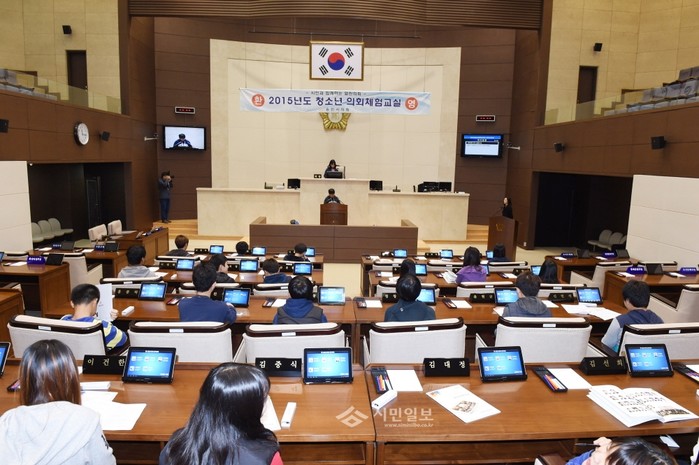 지난 10일 경기 용인시의회가 의회를 방문한 능원초등학교 30여명을 대상으로 '청소년 의회체험교실'을 연 가운데 학생들이 의장·의원·공무원 등의 역할을 나눠 조례안 심의를 진행하고 있다. (사진제공=용인시의회)