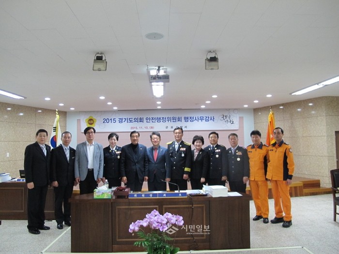경기 군포소방서는 지난 10일 3층 대회의실에서 화재 및 구조·구급현장활동 및 소방안전점검 등 소방행정업무 전반에 대해 경기도의회로부터 심도 있는 행정사무감사를 받았다. 사진은 감사가 끝난 후 관계자들이 기념촬영을 한 모습.(사진제공=군포소방서)