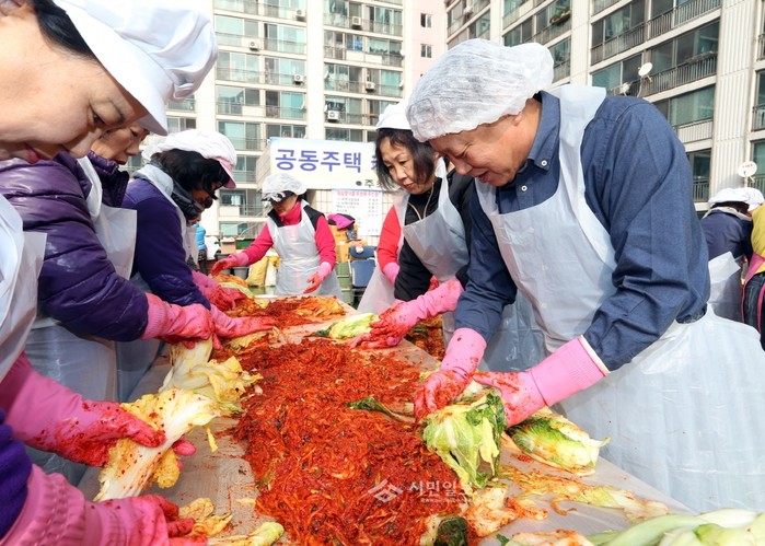 11일 오전 9시 서울 금천구 시흥동 벽산2단지 아파트 옥상에서 '사랑의 김장 나누기 동네 큰잔치'가 진행됐다. 사진은 차성수 금천구청장(오른쪽)을 비롯한 관계자들이 김치를 담그는 모습.(사진제공=금천구청)