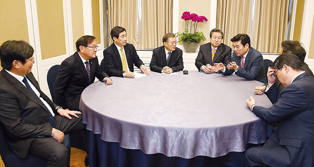 선거구획정 법정시한을 이틀 남겨둔 11일 서울 여의도 국회 의원식당에서 여야 지도부들이 이틀 연이어 ‘4+4 회동’ 을 열고 내년 총선에 적용될 선거구 획정 담판 논의를 하고 있다. 왼쪽부터 새정치민주연합 이춘석 원내수석부대표, 김태년 정개특위 간사, 이종걸 원내대표, 문재인 대표, 새누리당 김무성 대표, 원유철 원내대표, 이학재 정개특위 간사, 조원진 원내수석부대표.
