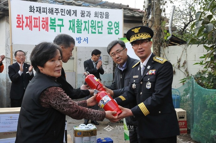 서울 동작소방서는 지난 11일 오후 2시 동작구 성대로에서 화재발생으로 피해를 입은 저소득가정에 화재피해복구 주택 입주식을 진행했다. 사진은 입주식에서 서순탁 서장이 소화기를 전달하는 모습.(사진제공=동작소방서)