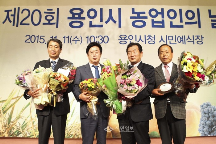 경기 용인시는 지난 11일 오전 11시 시청 시민예식장에서 정찬민 시장(왼쪽에서 두 번째)을 비롯해 시의장, 지역 국회의원, 농업관련 단체장, 농업인 등이 참석한 가운데 제20회 '농업인의 날’ 행사를 진행했다.(사진제공=용인시청)