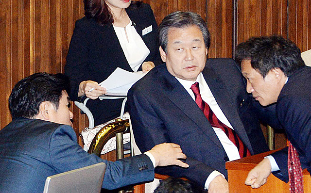 12일 오후 서울 여의도 국회 본회의장에서 새누리당 김무성 대표, 원유철 원내대표, 이학재 정개특위 간사가 본회의를 마치고 다시 재개될 선거구 획정안 협상을 위해 심각하게 의견을 나누고 있다.
