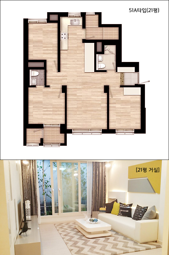 전용면적 69.42㎡(구21평)의 경우에도 넓게 빠진 차별화된 구조와 공간설계로 방 3개와 화장실 2개, 그리고 넓은 거실과 주방까지 갖추고 있다.