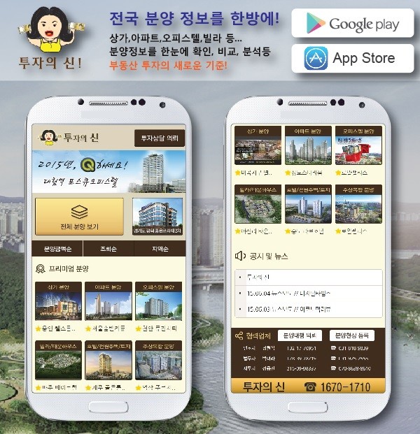 투자자는 발로 뛰어 제한적인 분양정보와 한정된 투자처를 알 수 있었지만 “투자의 신” 어플에는 아파트 분양, 수익형 호텔 분양, 오피스텔 분양, 상가 분양, 빌라 분양, 타운하우스 분양까지 투자자들이 알기 쉽고 사용하기 편리하게 만들어 졌다.