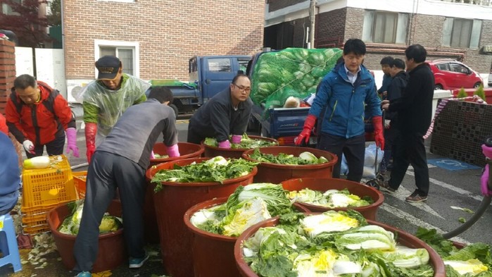경기 수원시 팔달구 우만1동은 최근 우만1동 주민자치위원회 등 단체연합회 165명과 추운 겨울을 맞이해 사랑의 김장 담그기 행사를 개최했다. 사진은 행사에 참석한 관계자들이 김장 준비를 하는 모습.(사진제공=팔달구청)