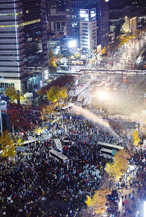 14일 저녁 서울 중구 시청 서울광장에서 민중총궐기대회를 마친 참가자들이 청와대로 행진하자 경찰이 물대포를 쏘고 있다. 민주노총, 전농 등 참가단체들은 이날 집회에서 정부가 추진하는 노동개혁과 역사교과서 국정화 정책을 규탄하고 청년실업, 쌀값 폭락, 빈민 문제 등의 해결책 마련을 요구했다.