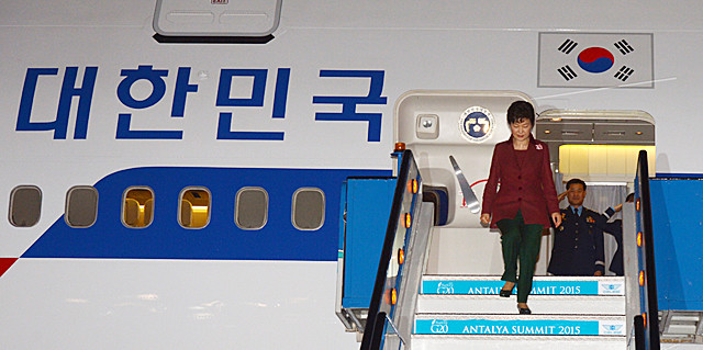 박근혜 대통령이 14일(현지시간) 오후 20개국 정상회의, G20에 참석하기 위해 터키 안탈리아 국제공항에 도착하고 있다.