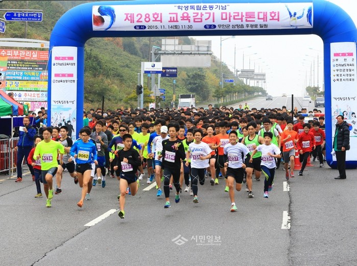 전남도교육청은 지난 14일 무안 남악지구 후광대로 일원에서 초·중·고교생과 교육가족 등 2000여명이 참가한 '제28회 교육감기 단축 마라톤대회'를 개최했다. 사진은 대회에 참가한 관계자들이 달리는 모습.(사진제공=전남도교육청)
