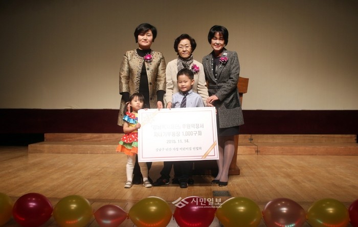 서울 강남구는 지난 14일 오전 10시 강남구민회관에서 '새싹동요제'를 개최했다. 사진은 행사에 참석한 신연희 강남구청장(뒷줄 가운데)이 복지재단 후원약정서를 전달받고 기념촬영하고 있는 모습.(사진제공=강남구청)