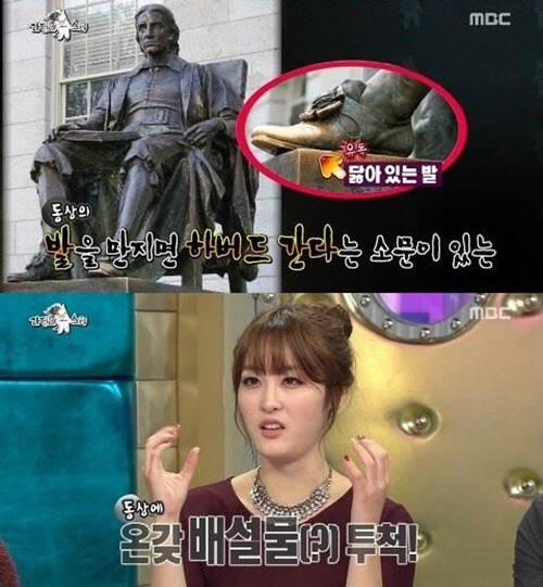 당시 방송에서 신아영은 "관광 오시면 존 하버드 동상이랑 사진 많이 찍으셨을 거다. 동상의 발을 만지면 자식이 입학할 수 있다는 소문이 있다"고 말했다.