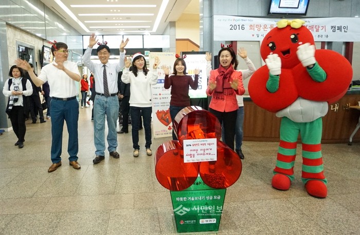 지난 16일 오전 서울 양천구청 로비에서 열린 '2016 희망온돌 사랑의 열매달기 캠페인'에 참여한 김수영 양천구청장(오른쪽에서 두 번째)이 직원들과 함께 성금 모금을 위한 캠페인을 벌이고 있다.(사진제공=양천구청)