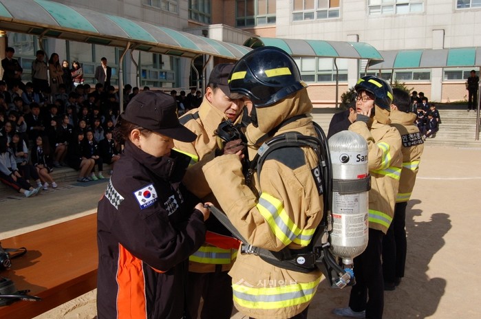 인천계양소방서는 최근 양촌중학교에서 학생 150여명이 참여한 가운데 '미래소방관 체험교실' 프로그램을 운영했다. 사진은 공기호흡기 및 방화복 착용 교육이 진행 중인 모습.(사진제공=계양소방서)