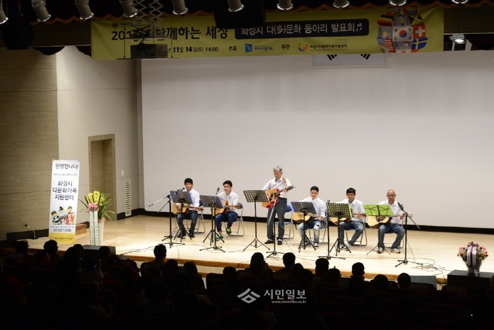 경기 화성시는 지난 14일 화성시근로자종합복지관에서 다문화 동아리 대회 ‘함께하는 세상’을 개최했다. 사진은 대회에 참가한 관계자들이 기타 공연을 진행하는 모습.(사진제공=화성시청)